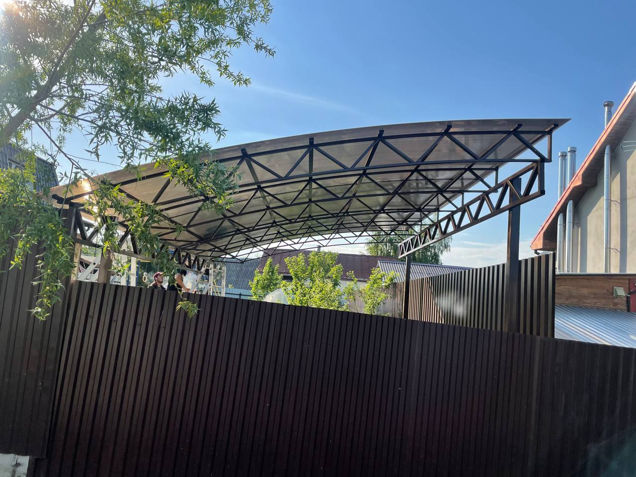 За день на даче изготовили арочный навес 5 на 7 с покрытием поликарбоната. Привезли уже готовые крашенные фермы и весь остальной материал. Все за собой убрали и увезли мусор. Молодцы!